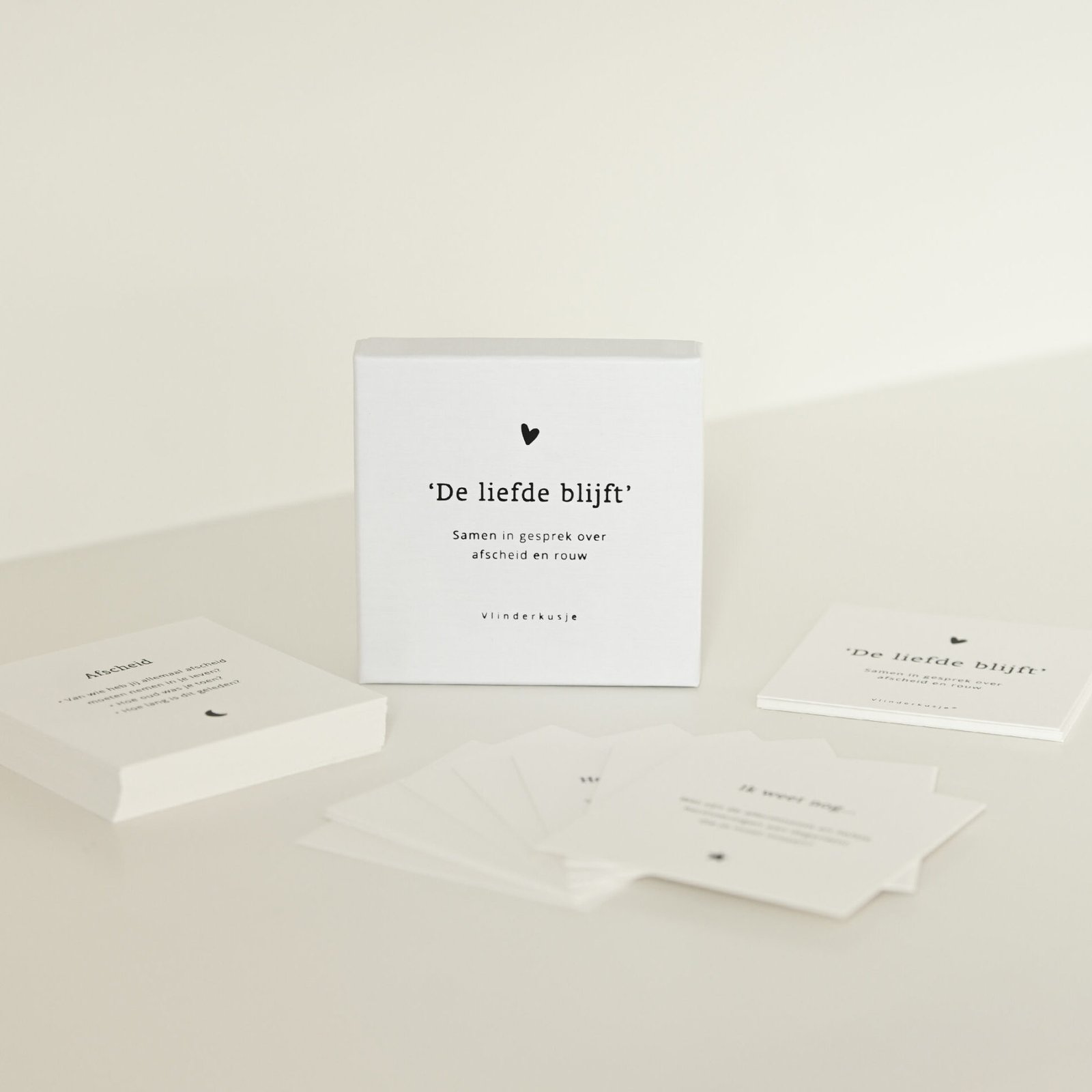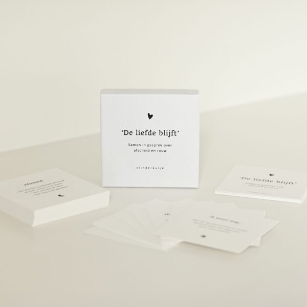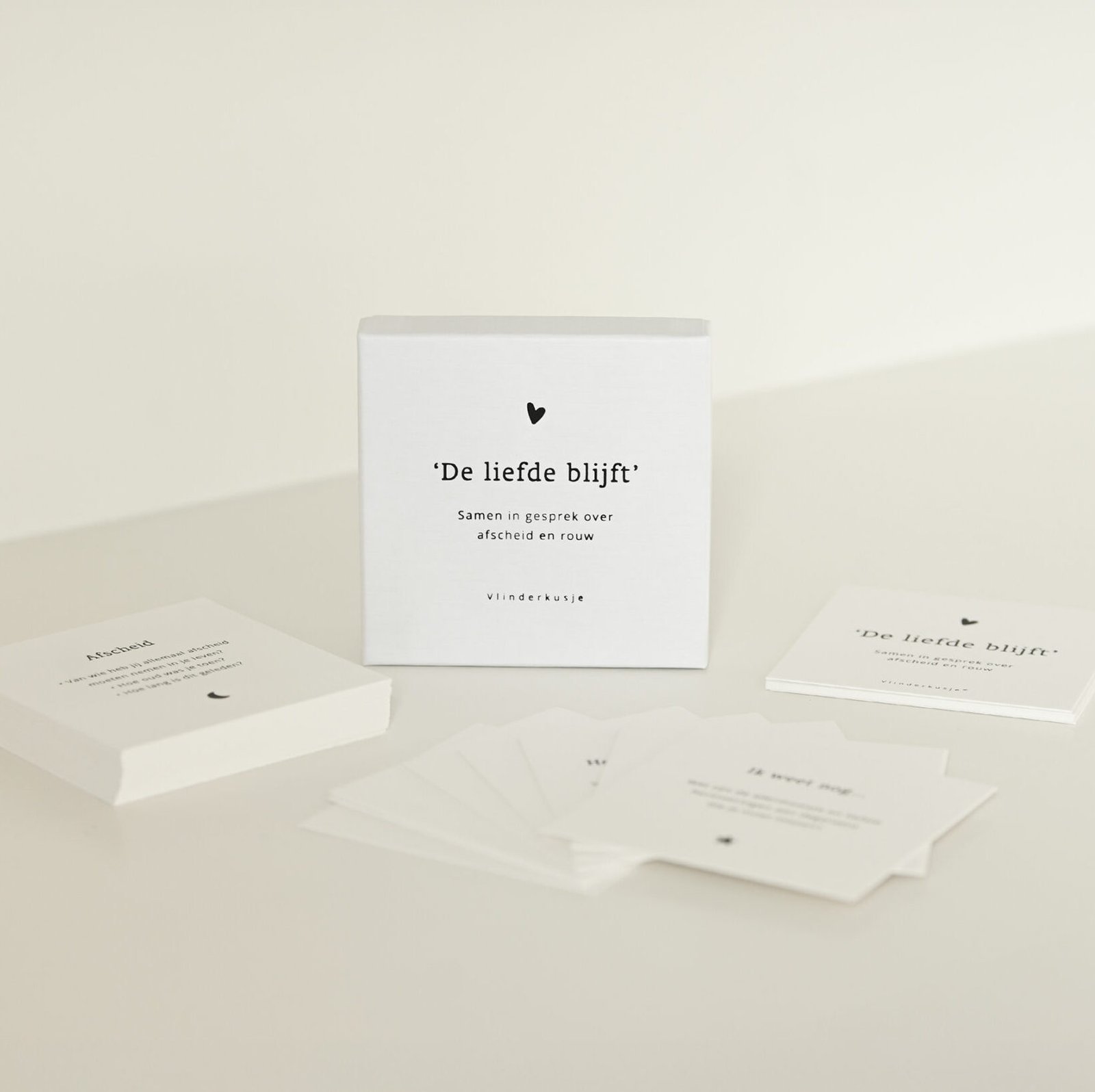 In dit doosje vind je 50 gesprekskaartjes met 40 onderwerpen en opdrachten omtrent afscheid en rouw.