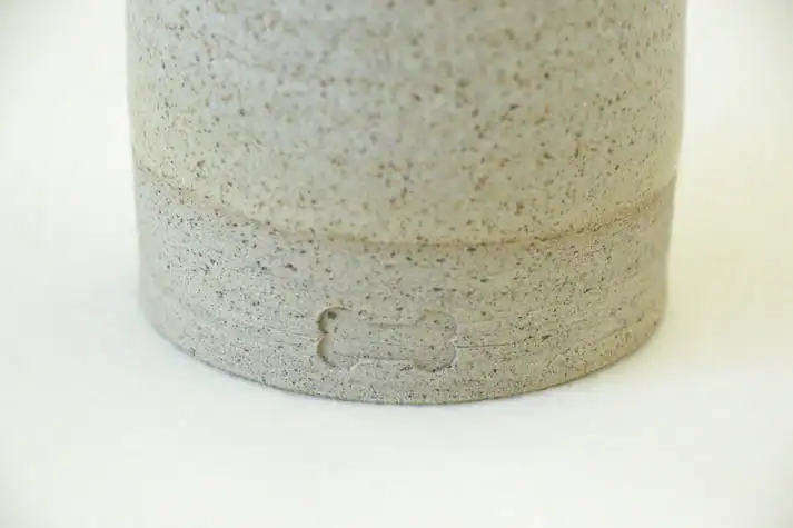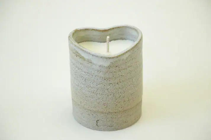 De kaars heeft een houder van beige spikkelklei en is lokaal gemaakt.