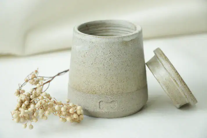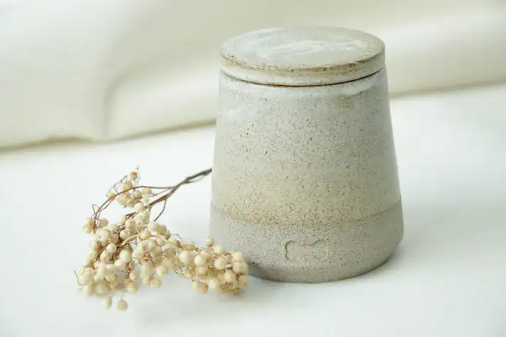 Wabimento heeft een kleine urne uit beige spikkelklei, lokaal handgemaakt en met een subtiel gegraveerd botje.