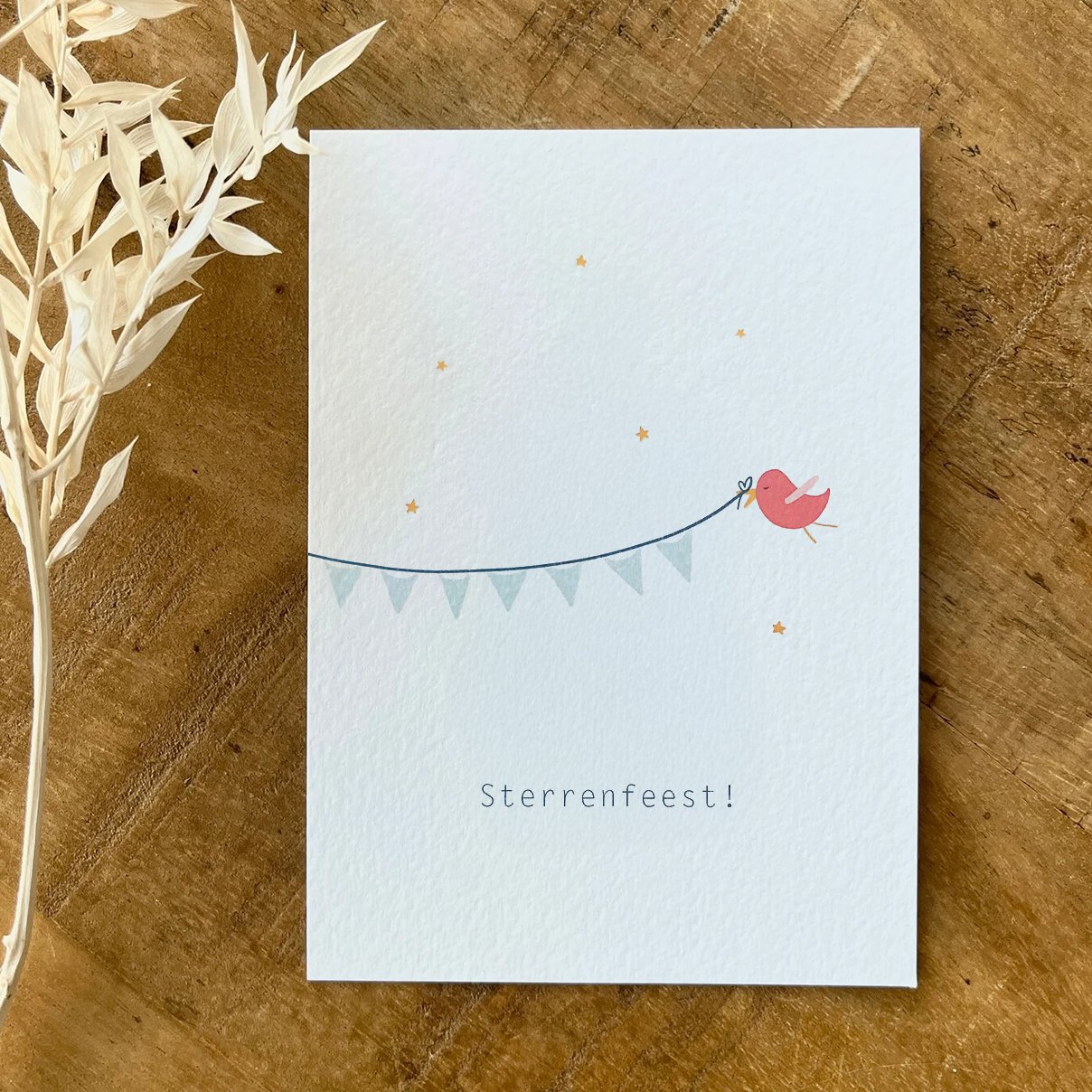 Een kaartje met een lieve illustratie van een vogeltje die een slinger omhoog houdt.
