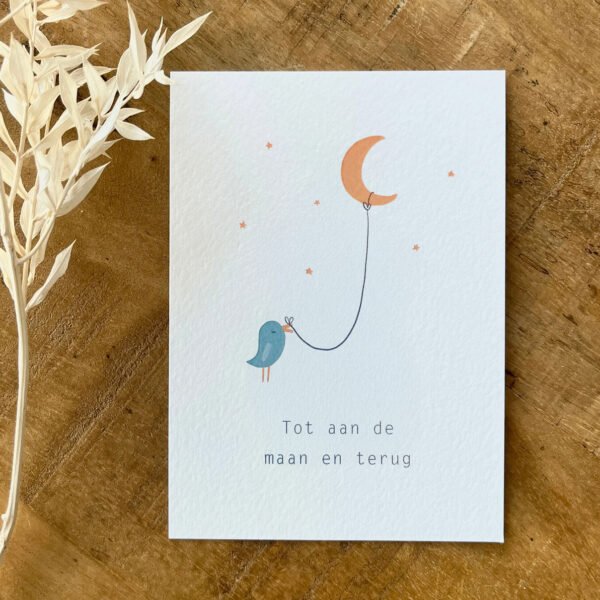 Een kaartje met een lieve illustratie van een vogeltje die de maan vasthoudt.