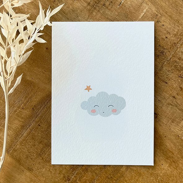 Een kaartje met een lieve illustratie van een glimlachend wolkje met een sterretje.